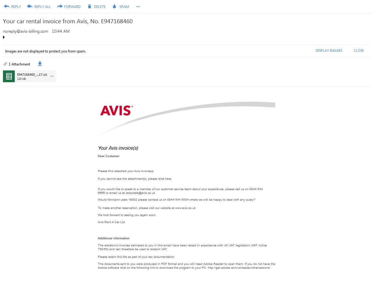 Excel macro malware (like banking trojan) appearing as Avis rental.