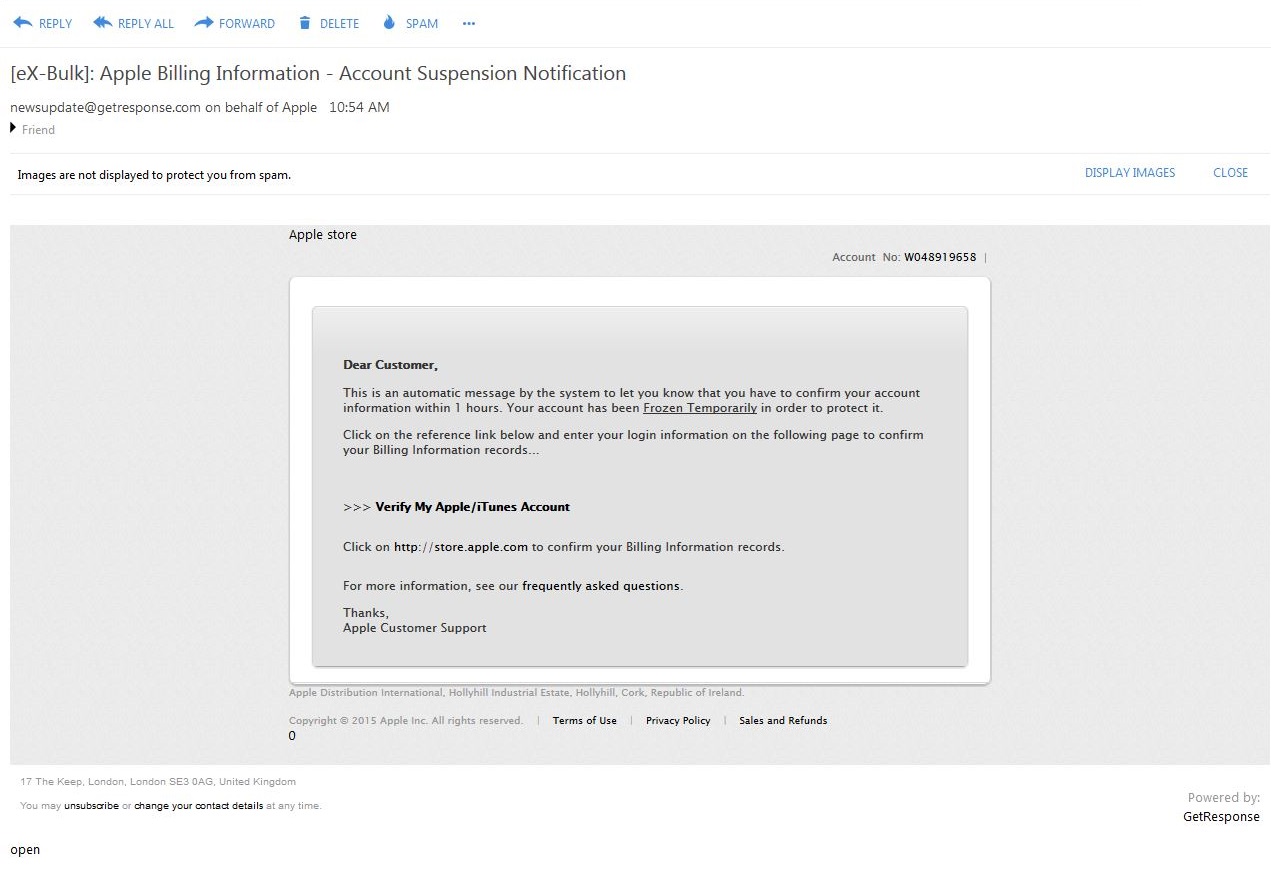 Apple phishing sent through and redirecting through GetResponse (email marketing).